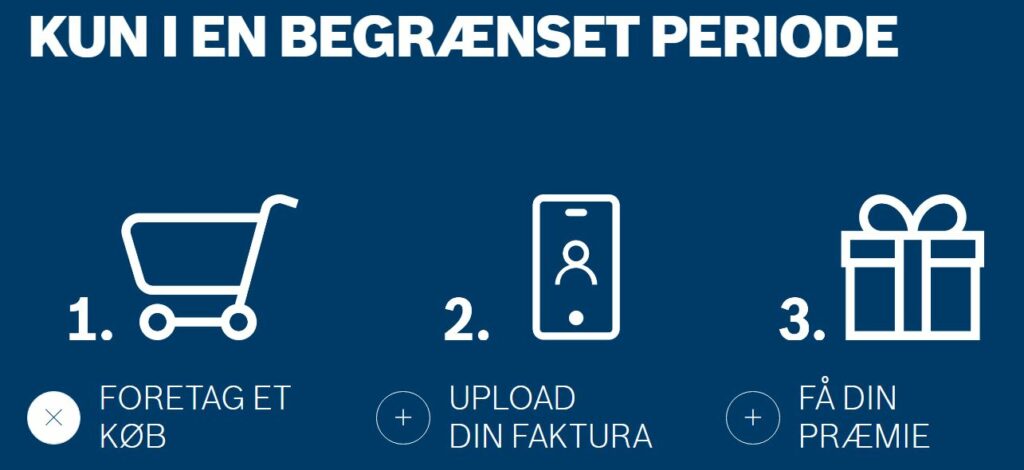 Når du har uploadet dit købsbevis, kan du vælge din præmie! De mest eftertragtede præmier er hurtigt væk, og derfor anbefaler vi, at du indløser din præmie så hurtigt som muligt. Vi sender dig løbende e-mails med statusopdateringer, så du kan følge din præmie, indtil den bliver leveret. Læs mere om gældende vilkår og betingelser for kampagnen. Så enkelt er det!