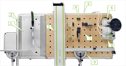 MFT 3: Alsidigt, præcist og mobilt Præcise resultater - Føringsskinnen kan indstilles til forskellige materialetykkelser og sørger for præcis føring af Festool overfræser og stiksav samt dyksav TS 55, det giver præcise resultater. Ved hjælp af vinkelanslaget kan arbejdsemnerne desuden placeres og justeres præcist, så der arbejdes vinkelnøjagtigt. Også gentagne snit eller serieproduktion er mulig, ved hjælp af anslagsrytteren.