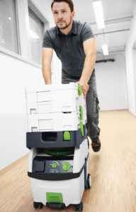 Med Festool systemet kan du koble, Festool støvsugere, værktøjskasser og kasser på kasser på kasser på …. Festool kalder kasserne systainere og hele Festool systemet har T-loc lukning der kobler det hele sammen og du kan rulle det hele afsted i et huk.