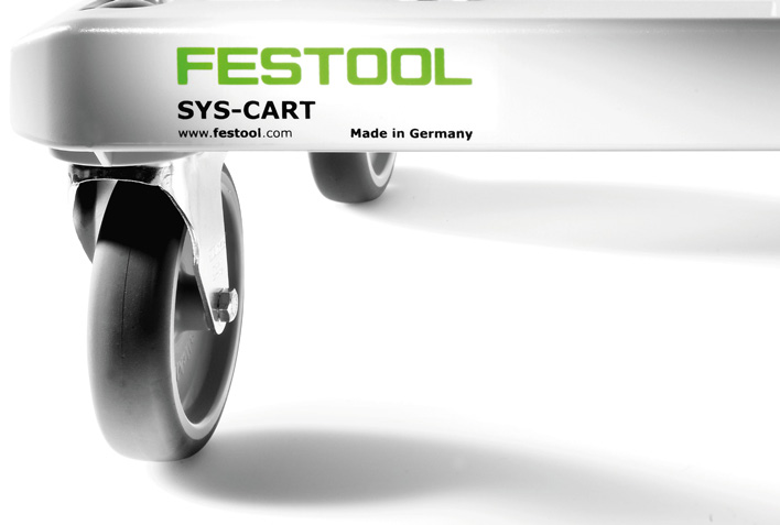 Festool rullebrættet med intelligent ekstraudstyr, er ideel til byggepladsen eller værkstedet. Alle fire store hjul kan drejes 360°. Derved forvandles Festool SYS-Cart til en manøvrerbar, mobil underkonstruktion. To af de fire hjul er udstyret med parkeringsbremser. Under transporten står Festool SYSTAINERNE sikkert i beholderen, og de to låseskydere giver ekstra sikkerhed. De robuste greb letter manøvrering og positionering af rullebrættet, og gør det let at transportere Festool systainere i størrelsen 1-5 og sortainere.