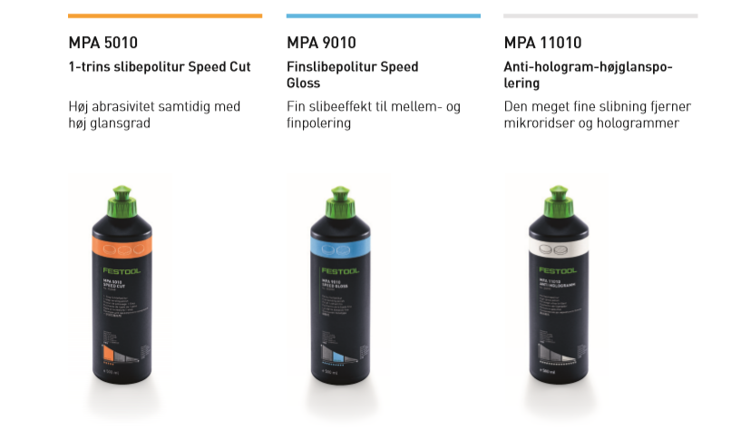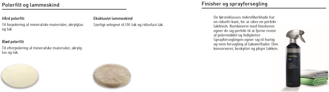 Perfekt i system: Skiver optimalt afstemt til maskine og anvendelse samt et bredt sortiment af svampe, filthætter og lammeskind (D 80 mm, D150 mm, D 180 mm, D 200 mm, 230 mm) samt politurer til ethvert formål