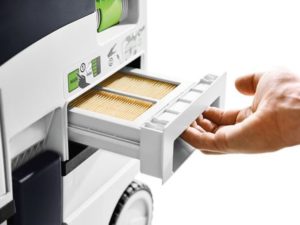 Der kan arbejdes uden afbrydelser, fordi fladfilteret kan udskiftes udefra og rengøres manuelt, indtil filterposen er fyldt helt op. Den nye, koniske Festool støvsugerslange med glat udvendig flade sørger for smidig udsugning uden, at slangen sætter sig fast og for en højere sugekapacitet.