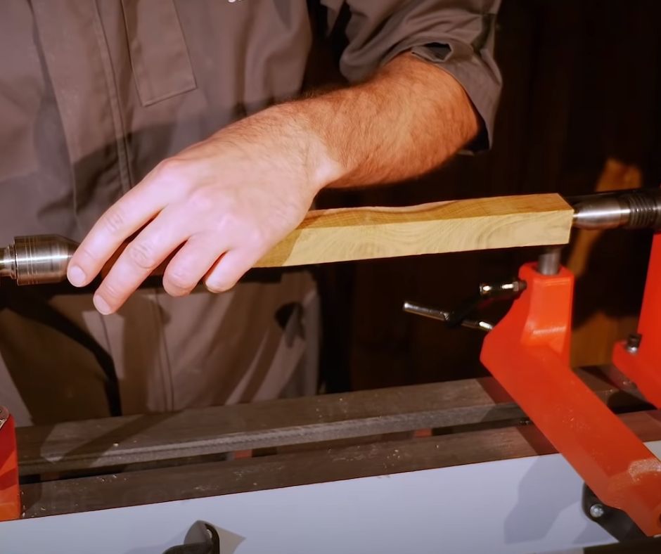 - Find et godt, langt stykke træ og spænd det op mellem din medbringer og medløber på drejebænken.