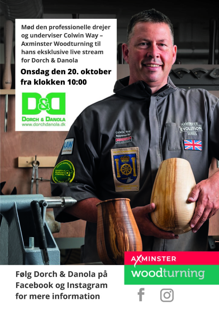 Så sker der igen spændende nyt her i trædrejerafdelingen hos Dorch & Danola. Den kendte drejer fra Axminster, Colwin Way, holder nemlig et eksklusivt online drejekursus for vores kunder live på YouTube. Kurset er GRATIS for alle, der har lyst til at deltage. Så se med onsdag den 20. oktober klokken 10:00 og bliv inspireret til nye og spændende projekter.
