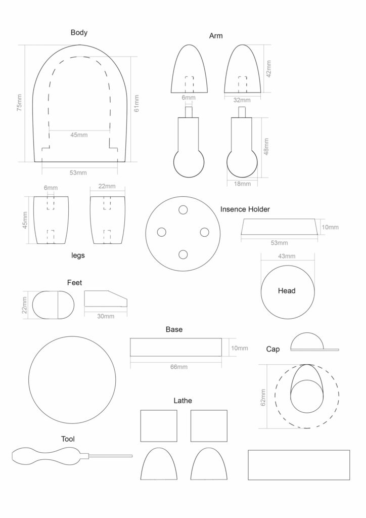 Her får du en tegning med de dele, som du skal bruge til at dreje en German Smoker. Du finder også tegning i linket herunder til German Smokers udformet som trædrejere.