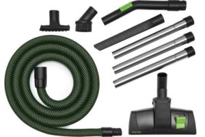 Kompakt håndværker rengøringsæt med støvsugerslange. Sættet indeholder en bøjning, 3 forlængerrør i rustfrit stål og to mundstykker til rengøringsarbejde. Et mundstykke til gulvbelægninger, samt et fugemundstykke til opsugning af støv på svært tilgængelige steder. Rengøringssættet leveres i en praktisk systainer.