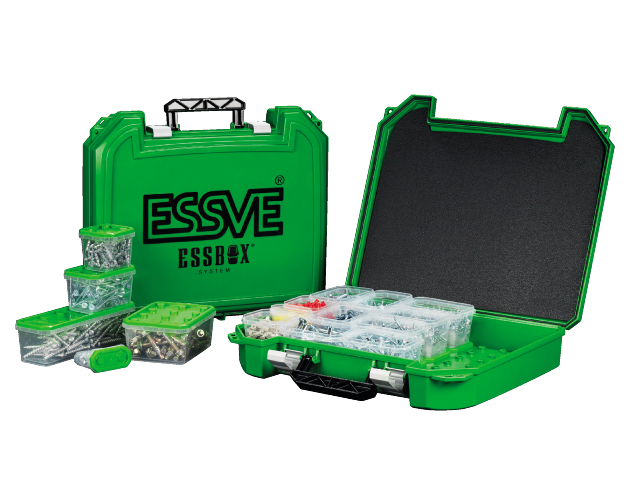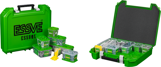 Alle ESSVE skruer leveres i plastikæsker der, modsat pap, er vandtætte og slagfaste. Det unikke låg gør det muligt at stable plastikæskerne, så de står fast. Alle ESSVE skrue æsker passer ned i ESSBOX kufferten, hvor du kan opbevare og transportere fra 1 til 12 æsker uden at skruerne falder ud. Så har du altid dine skruer ved hånden.