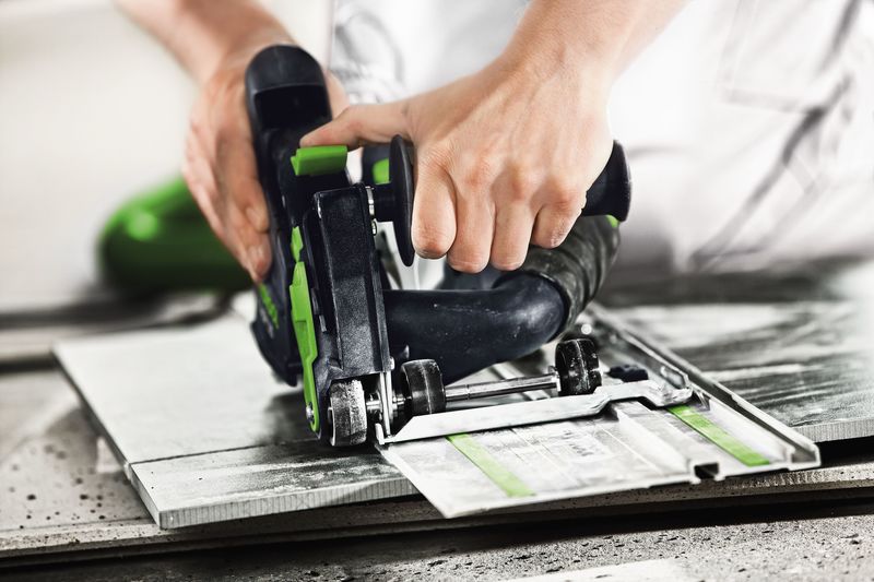 Med Festool's diamantskæremaskiner kan du let og stort set støvfrit skære store plader med håndholdte maskiner i stedet for en stor og klodset beton skæremaskine. Hjulene ruller godt på skinnen for alle former for sporing og med dybde justeringen sikrer du, at du ikke skærer i gulvvarme eller imprægnering ved udskiftning af gamle fliser.