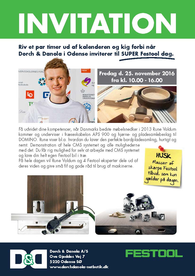 Riv et par timer ud af kalenderen og kig forbi, når Dorch & Danola i Odense igen inviterer til SUPER Festool dag, fredag den 25. november 2016 fra kl. 10.00 - 16.00.